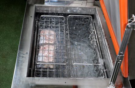 真空パックした鶏肉を−30℃のアルコールで凍らせ、通常の空冷式の急速冷凍では実現しえなかった冷凍技術でチルドに限りなく近い味わいのまま出荷されます。